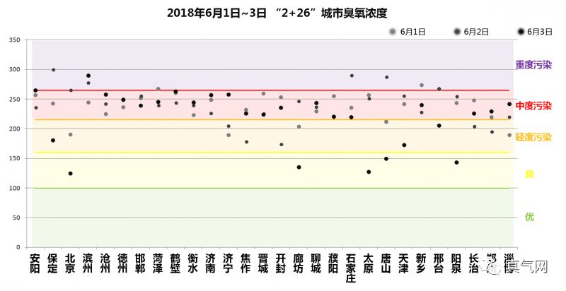 (数据来源于网络,未经审核仅供参考) 上图中我们可以发现,近日“2+26”城市臭氧浓度多数集中在215~265微克/立方米(中度污染)。