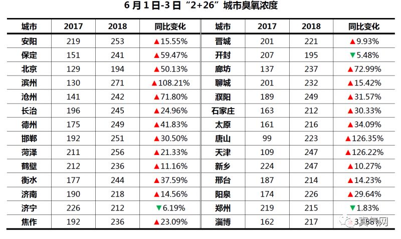 (数据来源于网络,未经审核仅供参考) 与5月不同,6月初25个城市臭氧浓度为同比上升,上升幅度最大的唐山同比变化率达到126.35%。其次为天津,同比增长126.22%。